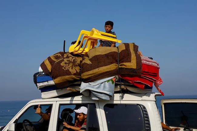 由於以色列的軍事行動,流離失所的巴勒斯坦人逃離加沙北部,一名兒童坐在汽車頂上(路透)
