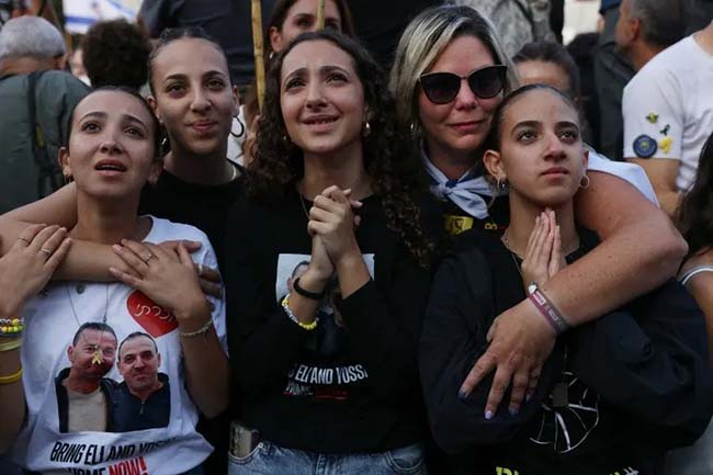 許多揮舞以色列國旗的民眾聚集在加薩附近的雷姆(Reim)軍事營地,人質將先被帶到那裏,然後轉送醫院。