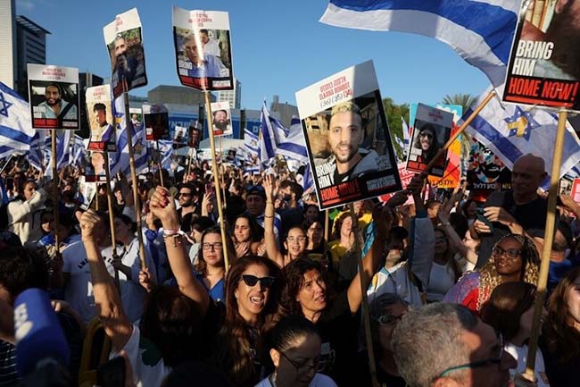 數百人聚集在特拉維夫的人質廣場(Hostages Square),他們歡呼雀躍,揮舞著以色列國旗,並高舉著人質的海報。