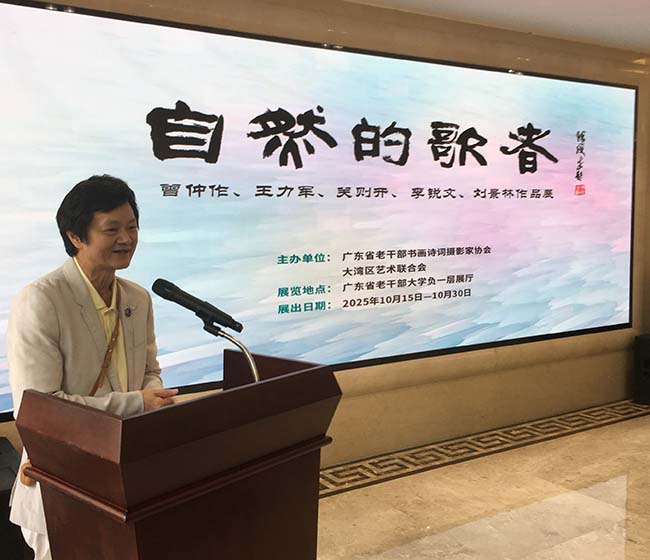 中華新聞通訊社/中華時報10月15日訊(攝影 關藝陽)2025年10月15日上午,“自然的歌者——曾仲作、王力軍、關則開、李銳文、劉景林等畫展”在廣東省老幹部大學展廳正式開幕。中華時報傳媒集團(香港)主席、香港藝術研究院院長、香港美術學院院長曾曉輝主席作為主禮嘉賓出席本次畫展開幕式,並代表主辦方宣佈開幕。此次活動由廣東省老幹部書畫詩詞攝影家協會、粵港澳大灣區藝術聯合會聯合主辦,彙聚多位退休老幹部藝術家的作品,以自然為主題展現銀髮群體的藝術生命力。