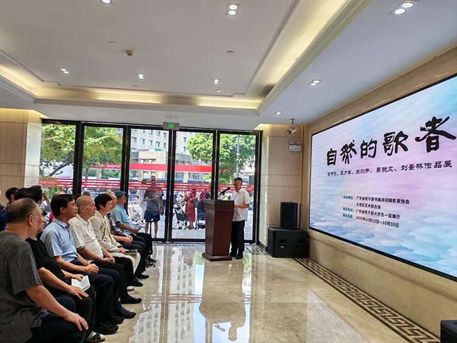 中華新聞通訊社/中華時報10月15日訊(攝影 關藝陽)2025年10月15日上午,“自然的歌者——曾仲作、王力軍、關則開、李銳文、劉景林等畫展”在廣東省老幹部大學展廳正式開幕。中華時報傳媒集團(香港)主席、香港藝術研究院院長、香港美術學院院長曾曉輝主席作為主禮嘉賓出席本次畫展開幕式,並代表主辦方宣佈開幕。此次活動由廣東省老幹部書畫詩詞攝影家協會、粵港澳大灣區藝術聯合會聯合主辦,彙聚多位退休老幹部藝術家的作品,以自然為主題展現銀髮群體的藝術生命力。
