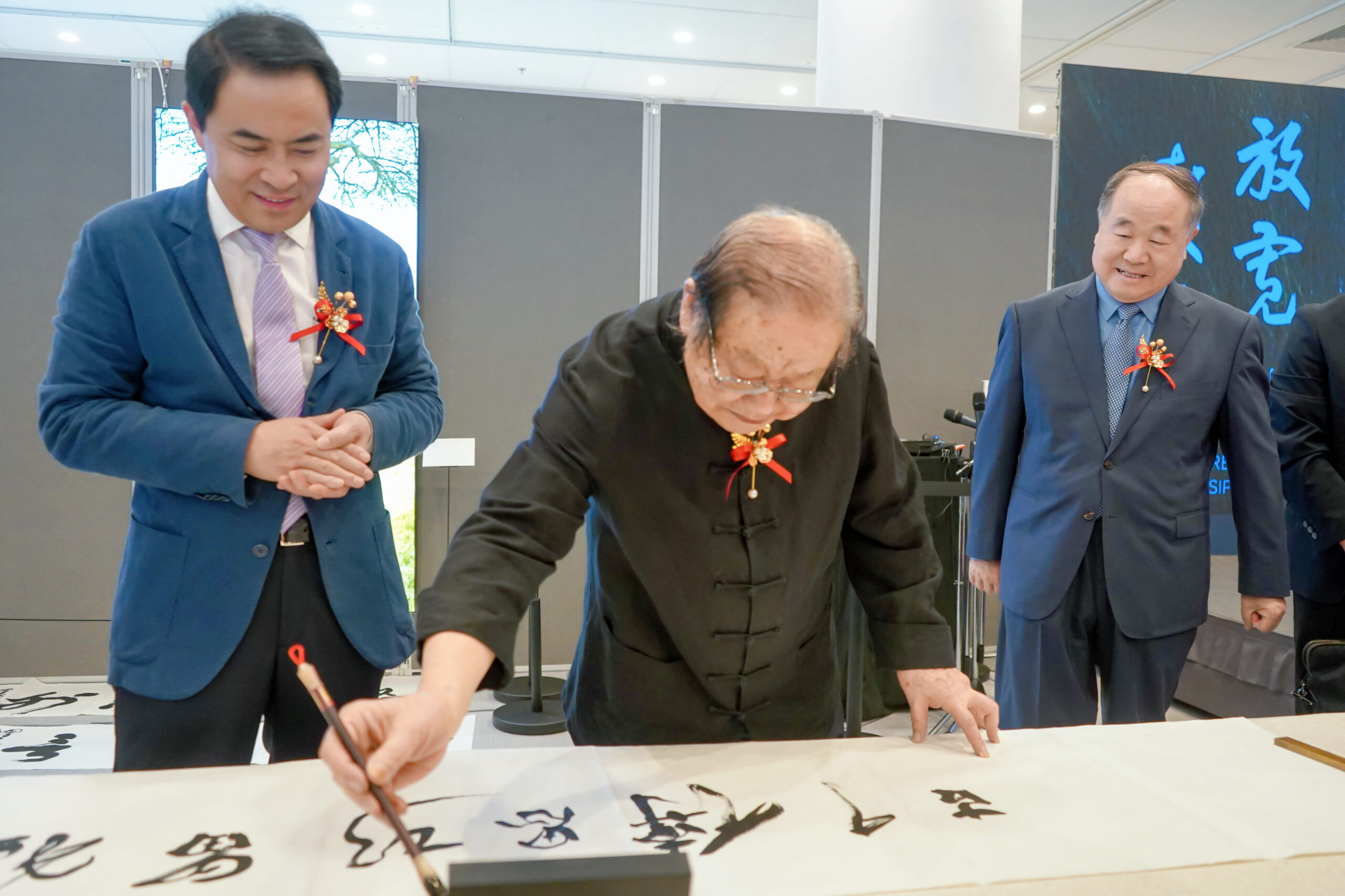 (中華時報訊)香港,2025年10月18日—— 香港中央圖書館今日迎來一場顛覆傳統的藝術涅槃。諾貝爾文學獎得主莫言與書法大家王振的「放寬心·喫茶去」書法攝影雙人展,在光濤墨浪間盛大啟幕。當中華時報傳媒集團主席、香港美術學院院長曾曉輝教授踏入展廳,目光觸及那些懸浮於光帷裏的翰墨精魄時,不禁駐足驚嘆:「此非展覽,實乃千年筆墨借科技羽翼浴火重生!」