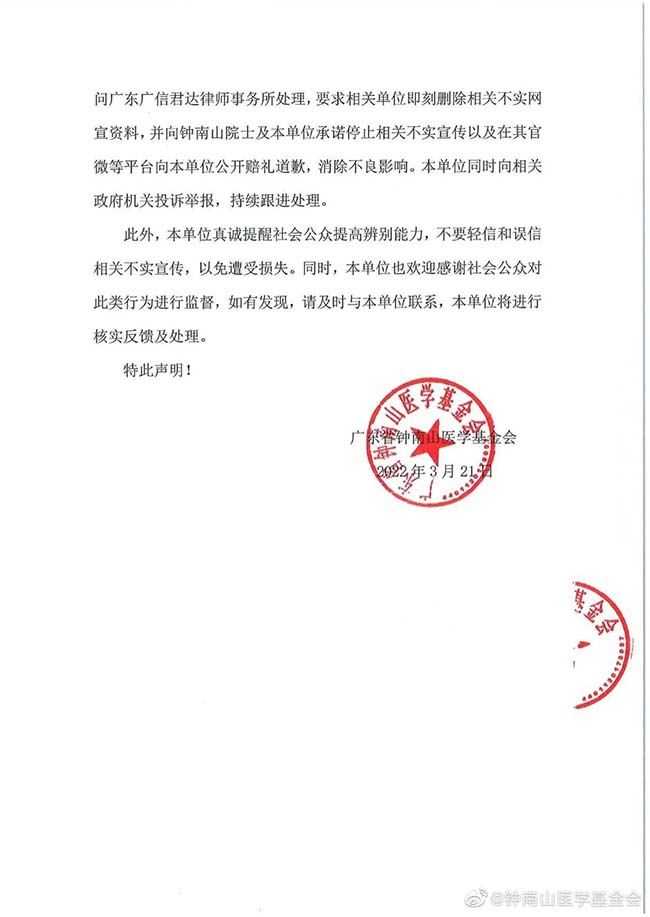 2022年3月21日,廣東省鐘南山醫學基金會發佈了關於“新冠能量飲”的聲明,點名羅凡華:“本單位全稱為廣東省鐘南山醫學基金會(簡稱鐘南山醫學基金會),是目前經授權使用‘鐘南山’名稱註冊的唯一基金會,視頻中羅凡華所稱的北京鐘南山創新公益基金會已於2020年9月更名為北京薈聚英才公益基金會,更名後該基金會因侵權以及違規已報相關部門進行處理。”聲明指出,鐘南山院士及該基金會從未推薦過“新冠能量飲”及其他任何商品;羅凡華的基金會冒用“鐘南山”名稱,該基金會涉及侵權以及違規。
