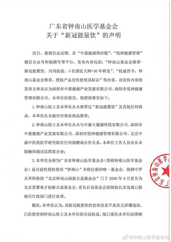羅凡華何許人也?海外作家們並不知情,他已經在國內鬧出了動靜,與大名鼎鼎的鐘南山院士掛上了鉤,並引出一段侵權糾紛。此事起因是涉案單位中惠健康、悅神健康等公司兜售“新冠能量飲”,稱該產品得到羅凡華為代表(法定代表人、理事長、秘書長)的“鐘南山創新公益基金會”授權,並展示一段羅凡華聲稱授權的視頻。