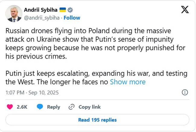 在波蘭境內發現不明無人機之後,烏克蘭外交部長安德烈·西比哈於9月10日在X平台上發帖稱:“普丁在不斷升級戰局並擴大戰爭規模,以試探西方。”