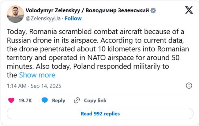 在無人機進入羅馬尼亞領空後,烏克蘭總統澤連斯基9月13日在X平台上張貼稱:“俄羅斯軍方清楚地知道他們的無人機的目的地,以及它們能在空中飛行多長時間。他們的路線總是經過精心計算的。”