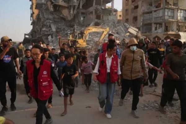 2025年10月17日,星期五,紅十字會工作人員抵達加沙地帶南部汗尤尼斯,哈馬斯成員正在搜尋被俘以色列士兵的遺......